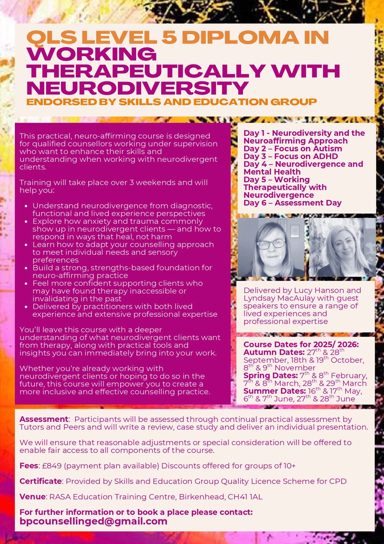 This practical, neuro-affirming course is designed for qualified counsellors working under supervision who want to enhance their skills and understanding when working with neurodivergent clients.